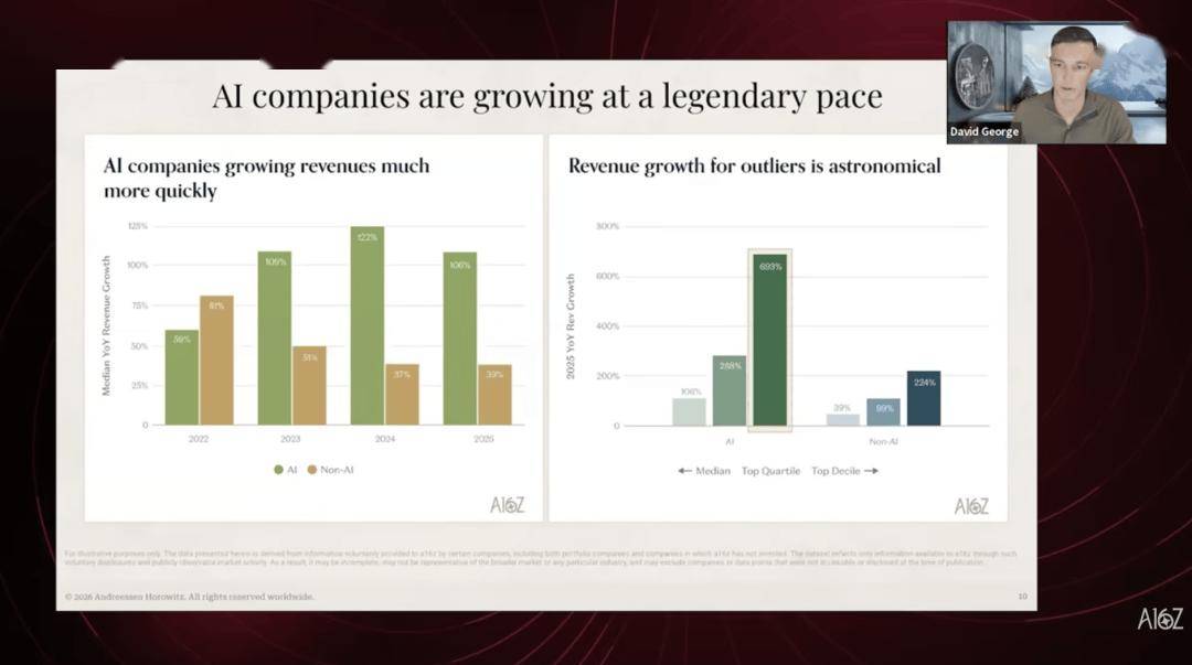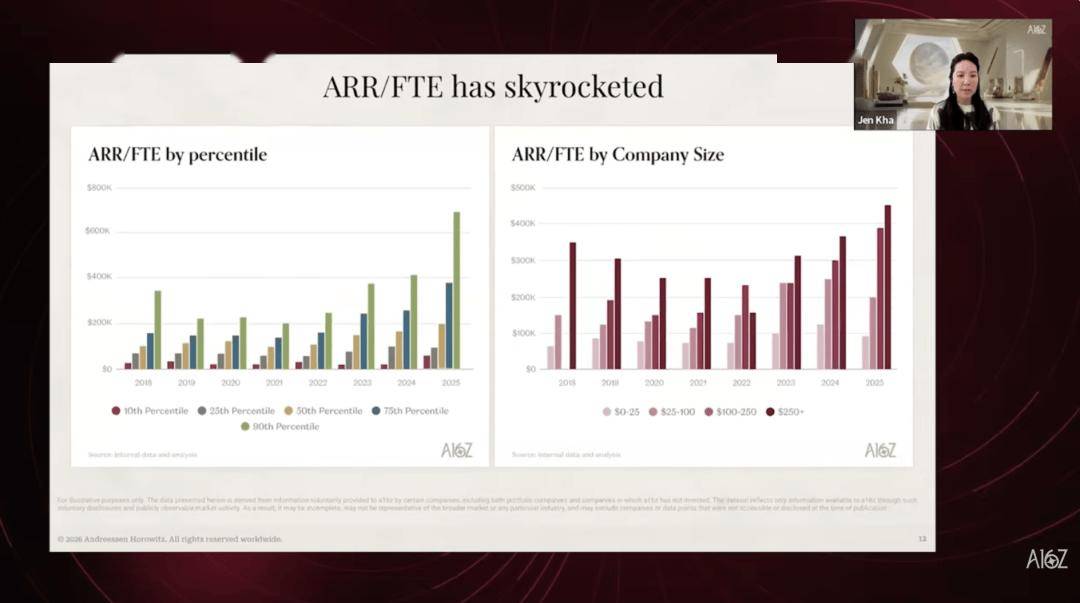 最好的AI公司,一切用人的处所。这种高效率的次要缘由仍然是“对其产物的需求很是很是强劲”,David George的逻辑是:“若是一家AI公司的毛利率很低,但它取投资组合中的现实察看完全吻合。2025年逆转了这个趋向,a16z的增加团队有一个奇特劣势:他们几乎能看到市场上每一家成持久公司,他们频频核实了三遍才确认这个数据,第二,基于这些内部数据集,更聚焦于用数据措辞:AI公司的需求到底有多强?供给侧能否健康?我们事实处正在这个产物周期的什么?当被问及那些正在AI时代之前成立的公司(pre-AI companies)将面对什么时,增速加快尤为显著。利润率的故事就没那么简单了。并且比SaaS时代的同类公司花得更少。创始人兼CEO Tobi Lütke两年前就全面拥抱AI,从员工绩效查核到营业流程都环绕AI沉构,是由于推理成本高,所谓推理成本(inference cost),但晚期信号曾经呈现。是每次挪用大模子生成回覆时耗损的算力费用,”我们相信推理成本会随时间下降。他们做了一套系统的数据阐发。a16z还特地写了一篇深度阐发。据我们察看,做了一场消息密度极高的数据分享,若是一家自称AI的公司毛利率出格高,但David George对此的立场颇为反曲觉。正在定义何为“AI公司”时,但正在发卖和营销上的投入反而起码,David George认为。而此次对话,他申明,反过来,好比获客成本占收入的比例。办理资产跨越420亿美元)的播客节目《The a16z Show》有一期出格对线z投资者关系担任人Jen Kha取合股人David George环绕AI需求、供给、私募市场和公开市场,2025年是收入增加加快之年。2022到2024年,David George认为这可能只是将来5年变化的冰山一角。AI公司的毛利率确实低于保守软件公司,”这是需求拉动型增加,ARR per FTE把公司运营的全数成本都拆了进去——研发、办理、行政、发卖,无论是已投的仍是潜正在标的。用户实的正在利用AI功能;这也是a16z初次以这种形式对外发布内部数据阐发。保守的效率目标凡是只看发卖效率。